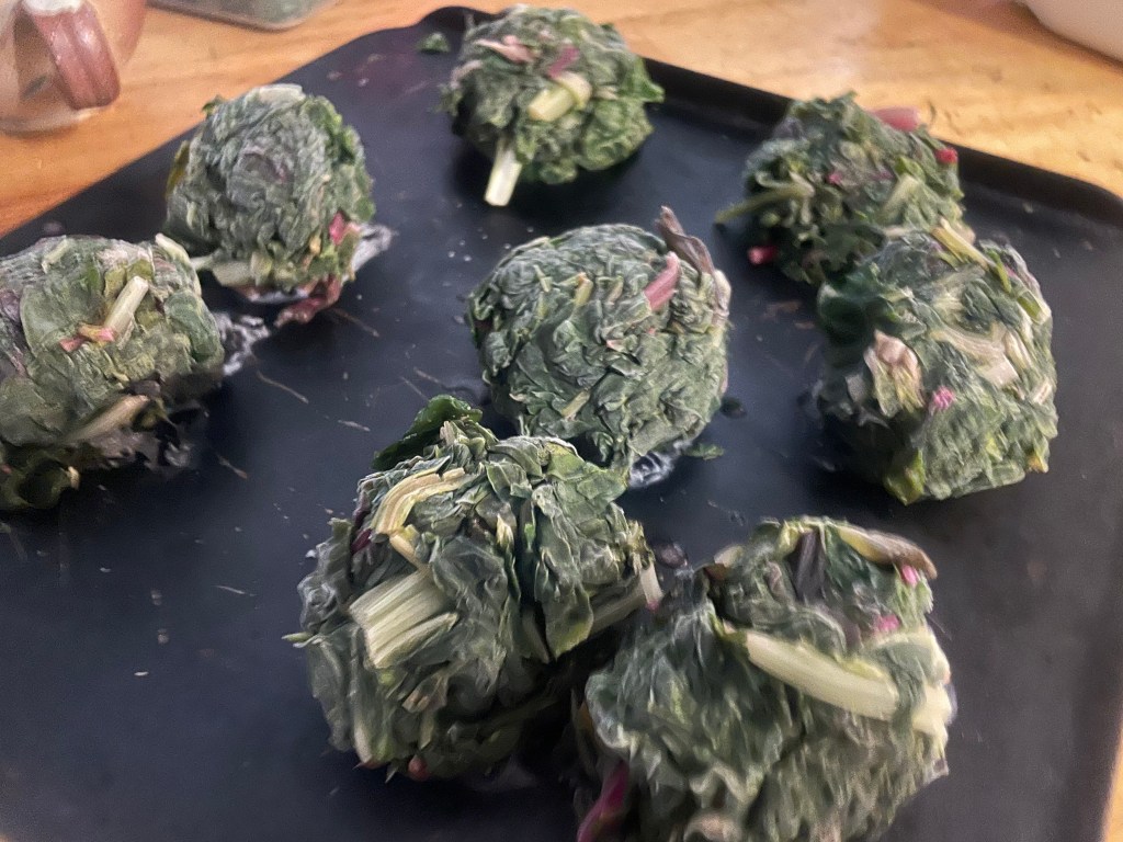 Once it had cooled enough to handle, I formed it into balls. (Think about the amount you’d like to add to a soup or stew.) The trick to a tasty end result is to squeeze and squeeze it getting out as much of the liquid as you can. Silverbeet seems to retain a lot of liquid so keep squeezing…think of it as a workout for your hands!