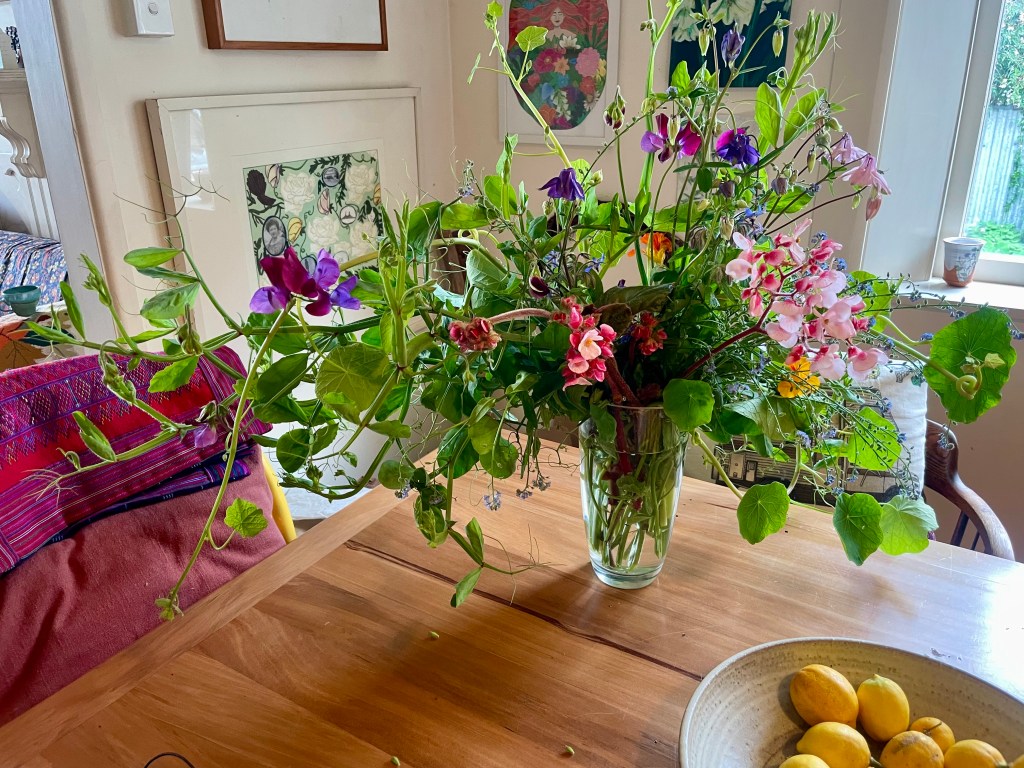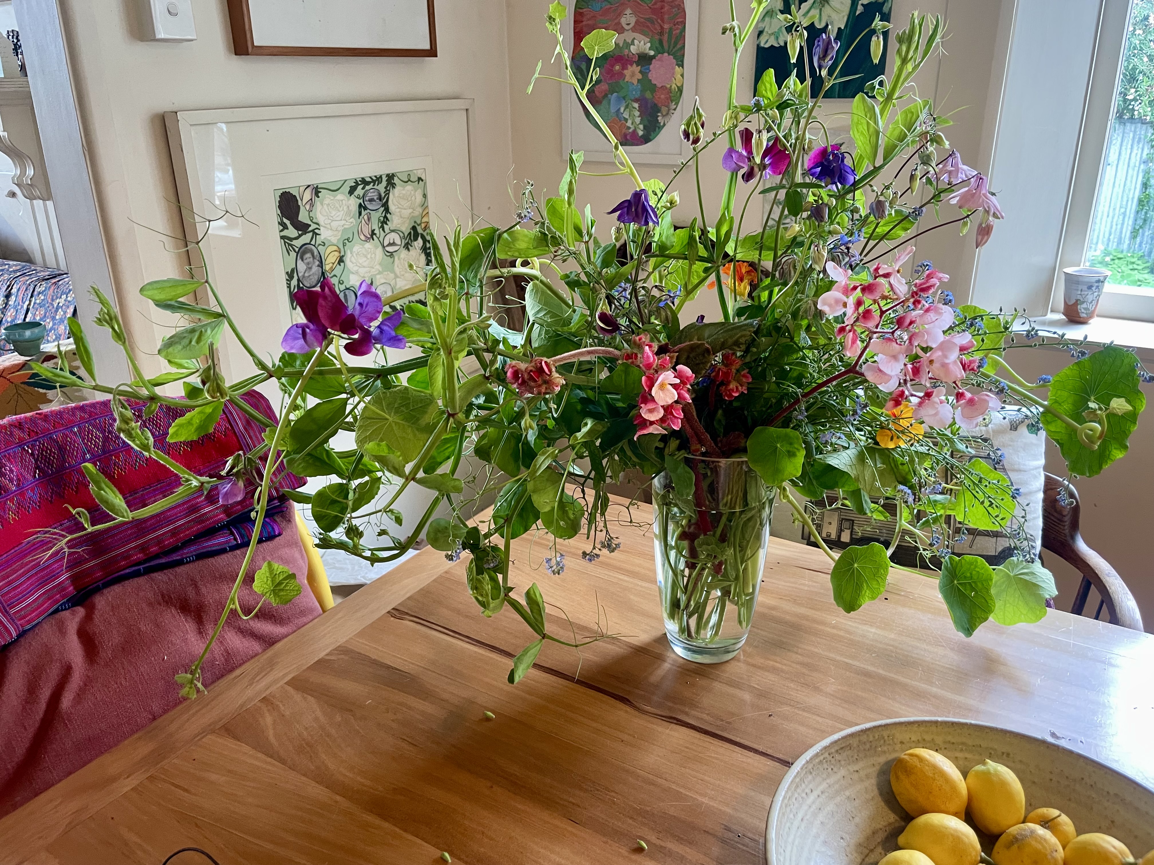 Here’s one of my wild and weedy bouquets. Each Friday I try to clear the table of all of the random stuff it accumulates over the week, give it a wipe and polish and pick a bouquet from the garden so we begin the weekend with at least one little spot of calm and beauty.