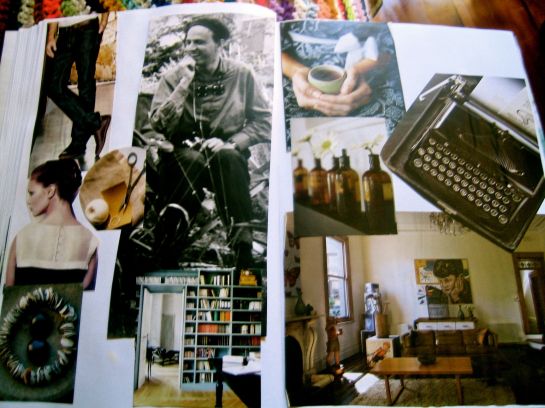 The wall beside my desk I put up a montage of inspirational images. It was overdue for a freshen up, so for a couple of months I slipped anything that caught my eye into a folder (magazine cuttings, mail my friends sent me, vintage book pages etc etc) until I had enough material to redo the wall.