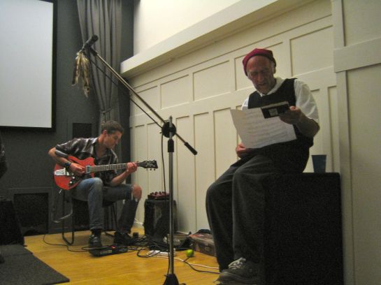 The local ‘support’ act was Rob Thorne who does amazing things with Nga Taonga Puoru and effects pedals. Then David was accompanied by Chris Heazlewood (formerly of King Loser) on guitar playing incidental music between and behind the poems. The guitar playing was subtle and interesting and enhanced the poetry very well.