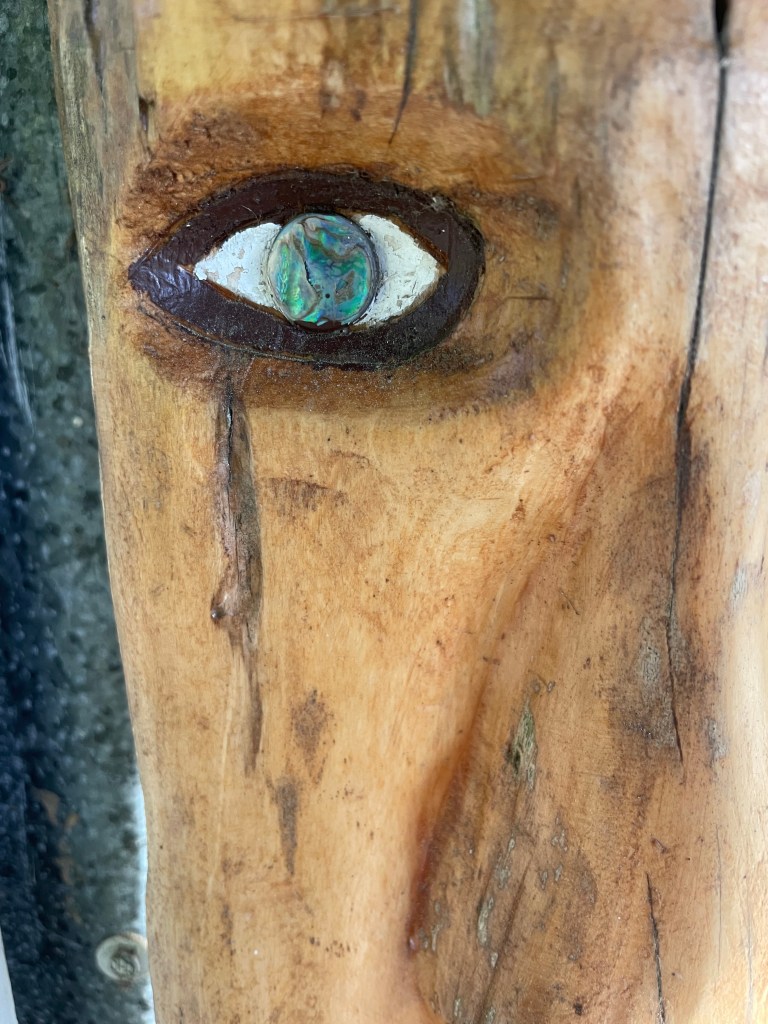 (Above: the hut had a kaitiaki with paua shell eyes.)