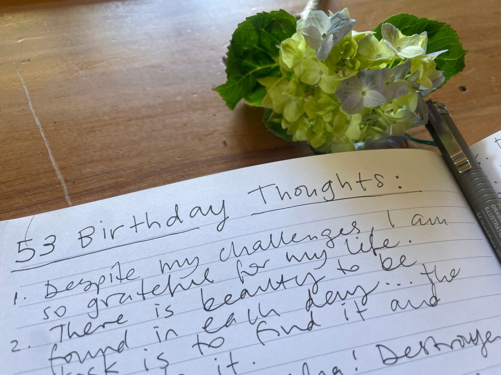 Fraser went off for a walk and I poured a huge cup of tea and opened up my journal. I love using lists as a way into writing in my journal so I decided to set myself the (gentle) challenge of writing 53 thoughts for my birthday. At the outset, I didn’t have any sense of what might come…I just wrote quickly – hoping to get to 53 before Fraser returned.
